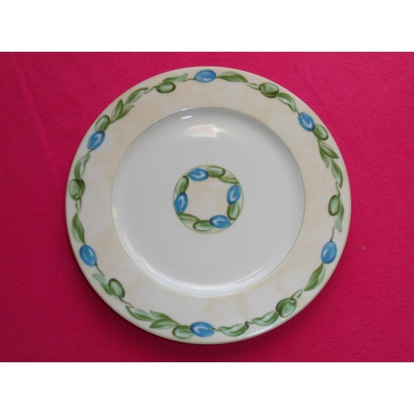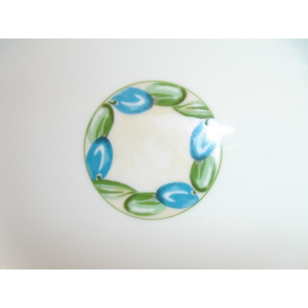Assiette en porcelaine de Limoges estampillée Tharaud, à décor d'olives réhaussées à la main.