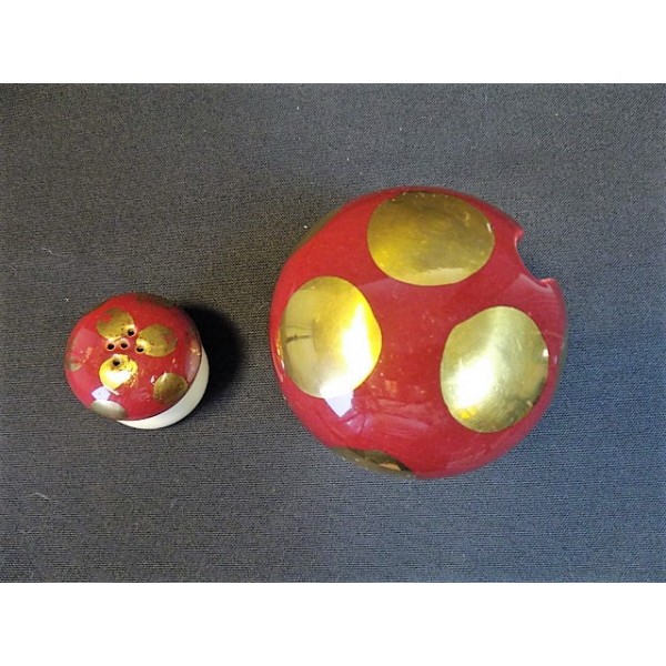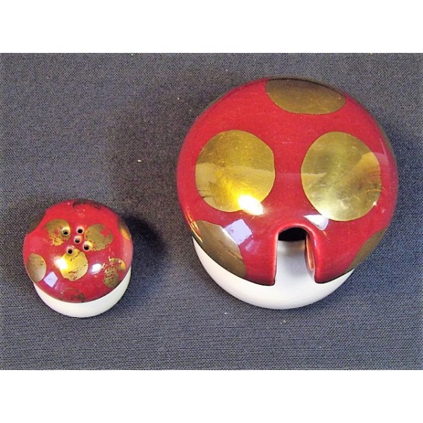 Dimensions: salt shaker max height 4.8 cm, max width 5 cm, poutardier max width 9 cm, max height 10 cm.