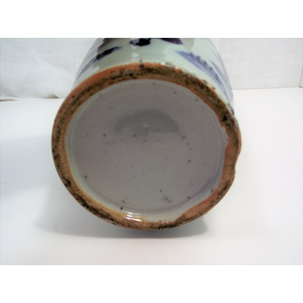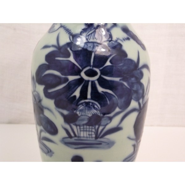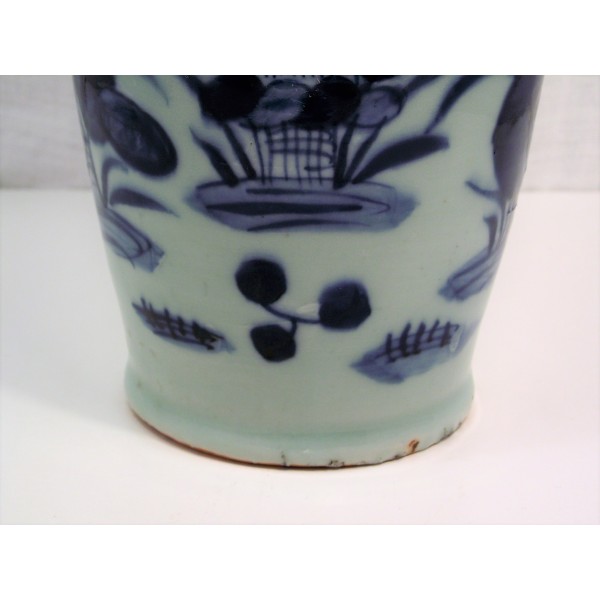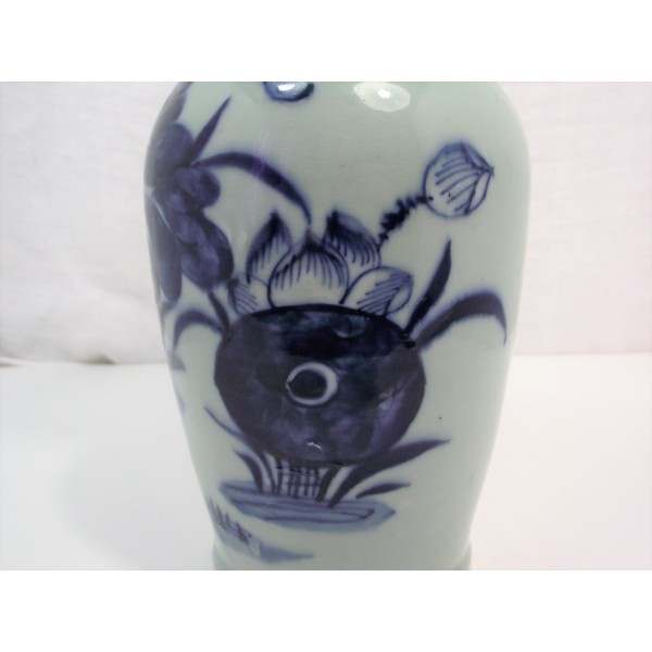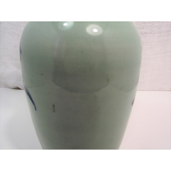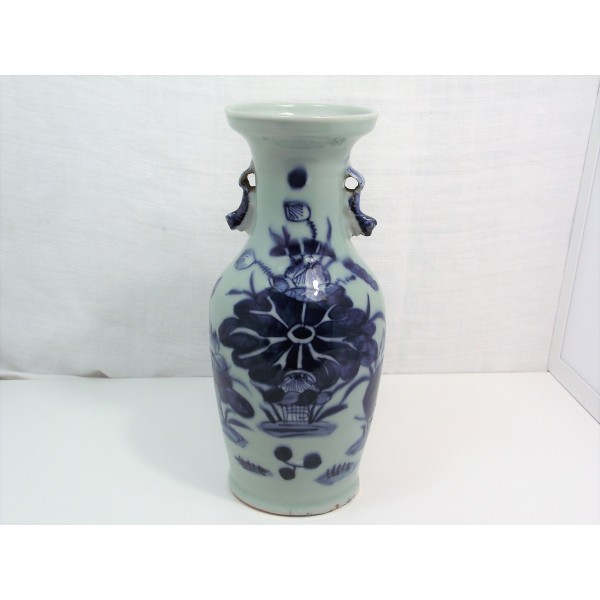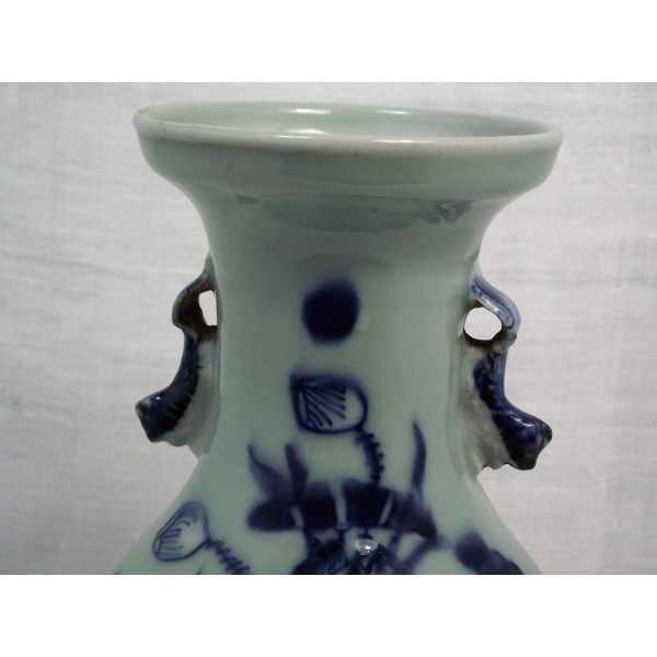 Ancient Chinese ceramic vase with celadon glaze, blue floral decoration, with two Fô dogs on the neck, before the 20th century.