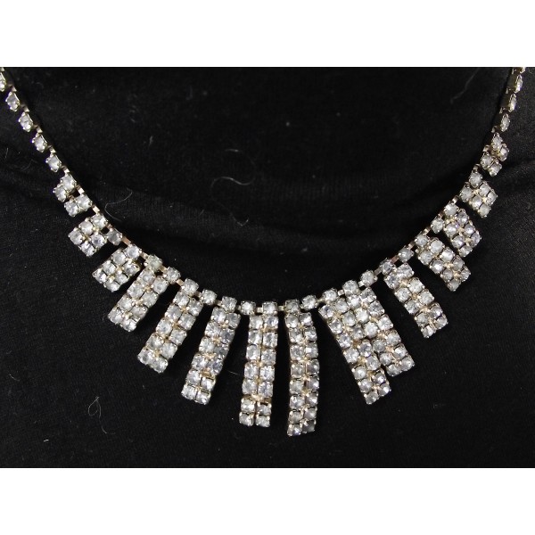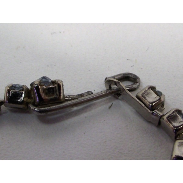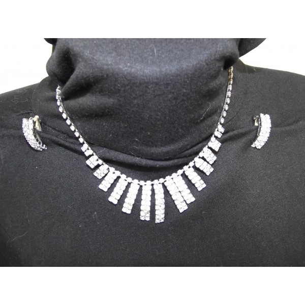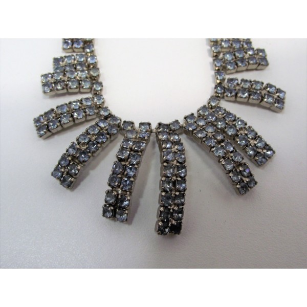 Set of jewelry from the 60s in silver metal and blue rhinestones, consisting of a necklace, a bracelet and a pair of clip earrings.