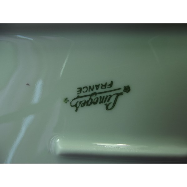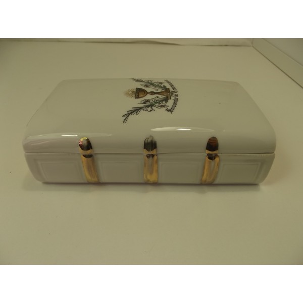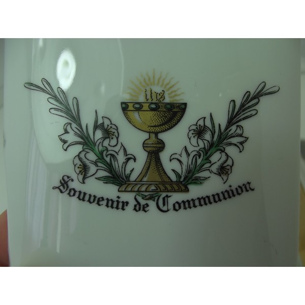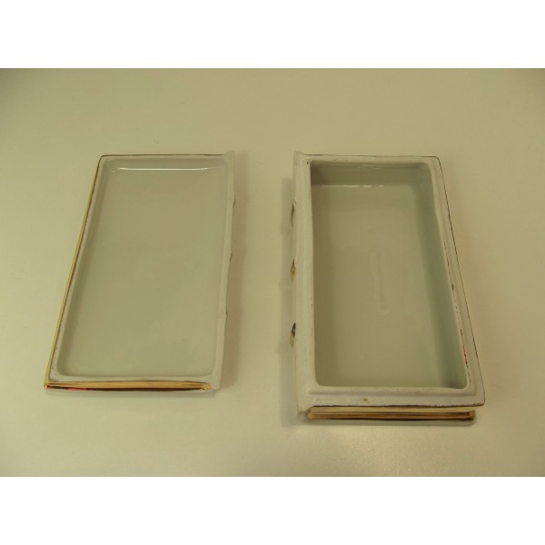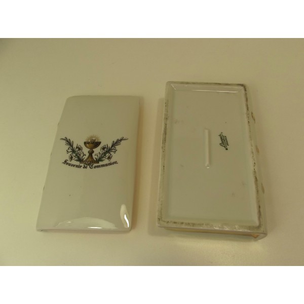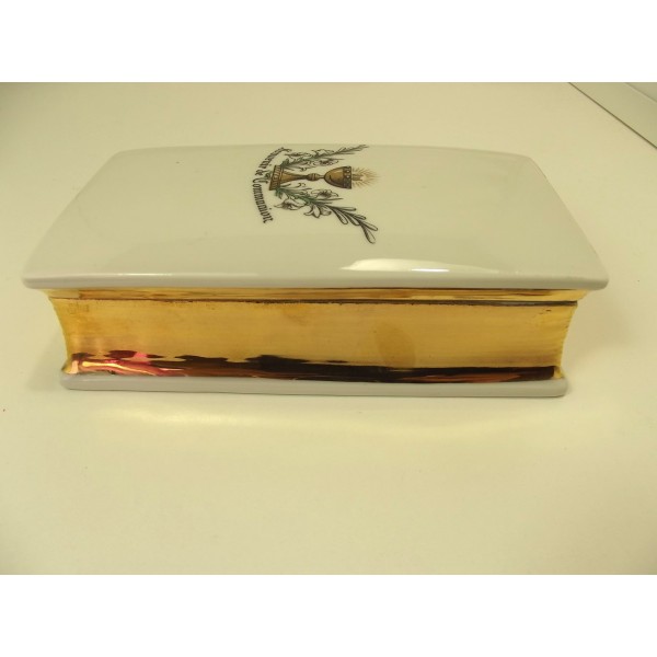 Porcelain candy box stamped Limoges France, in the shape of a book (bible) decorated with a chalice and flowering branches, inscription Souvenir of communion, gilding of the edge.