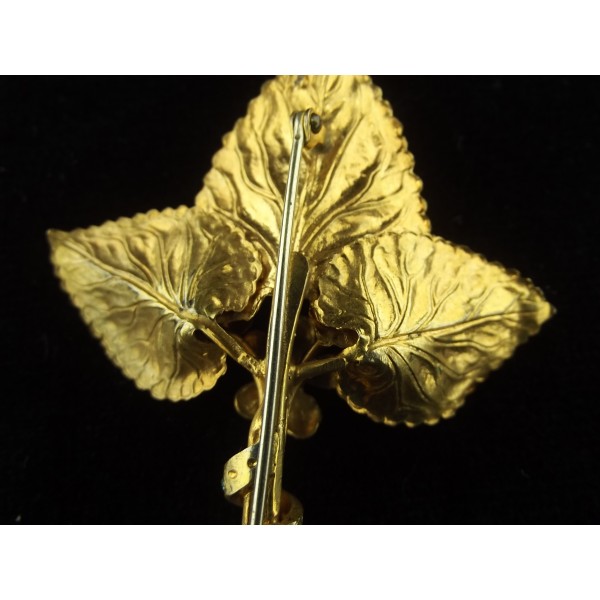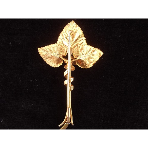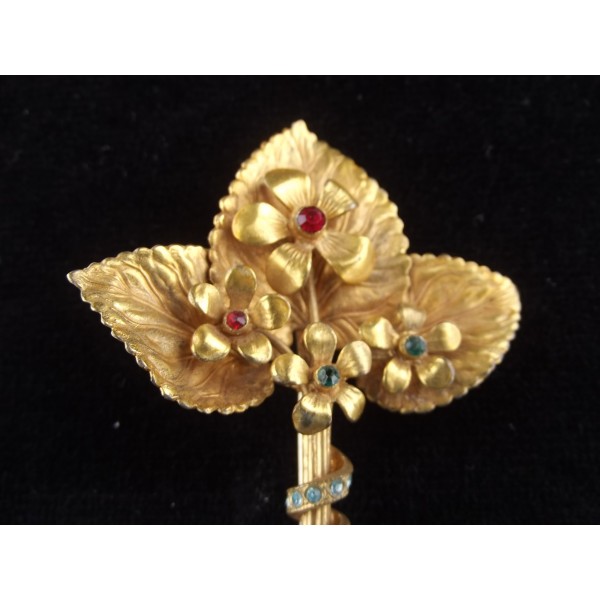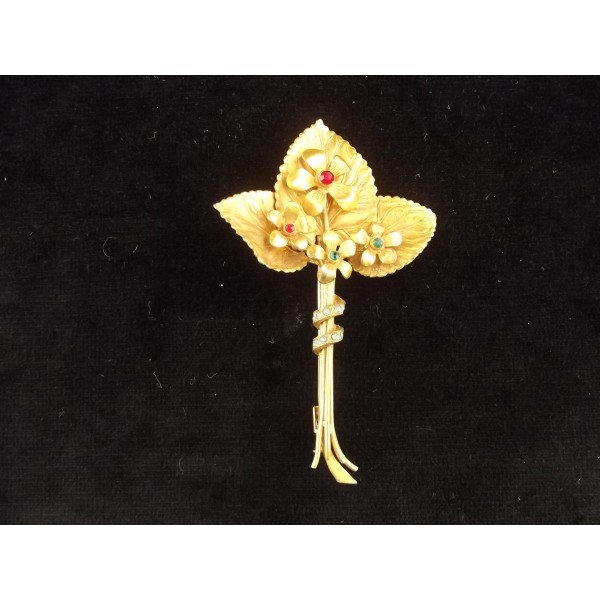 Broche ancienne en métal doré, figurant une feuille et des fleurs, coeurs strass rouges et vert, époque et style art nouveau.