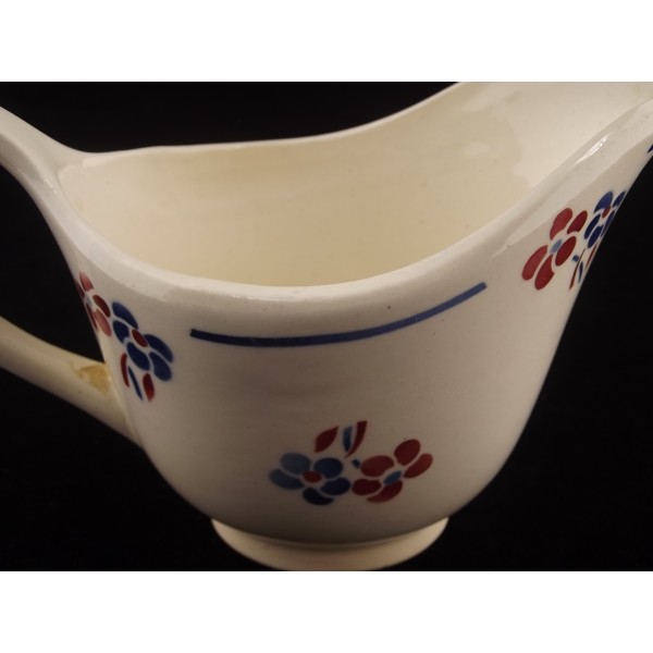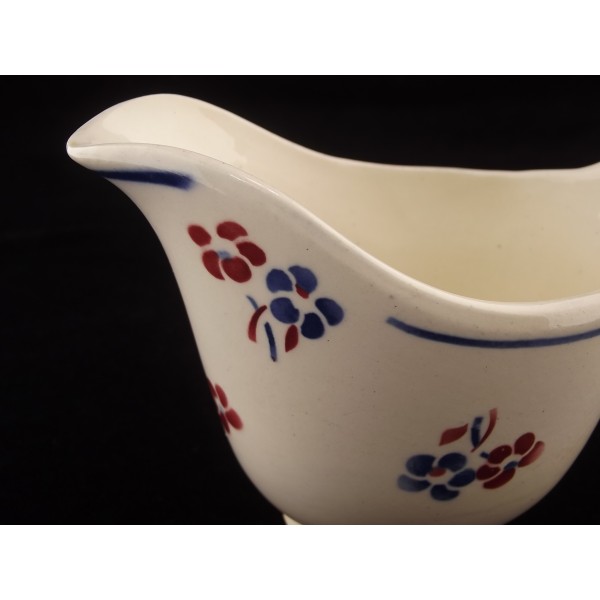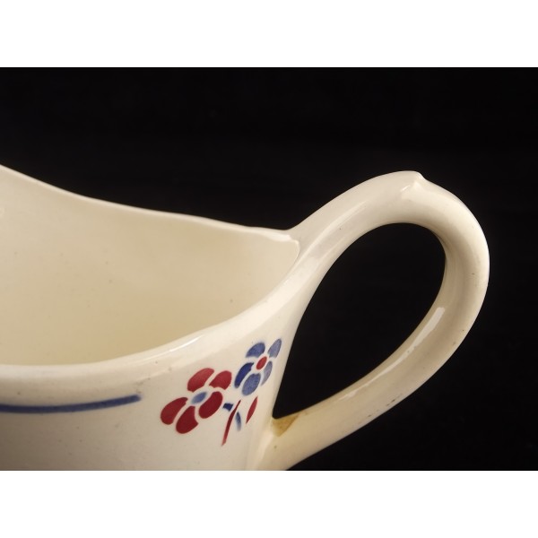 Old earthenware sauce boat stamped Badonviller, circa 1930, blue and red floral decoration.