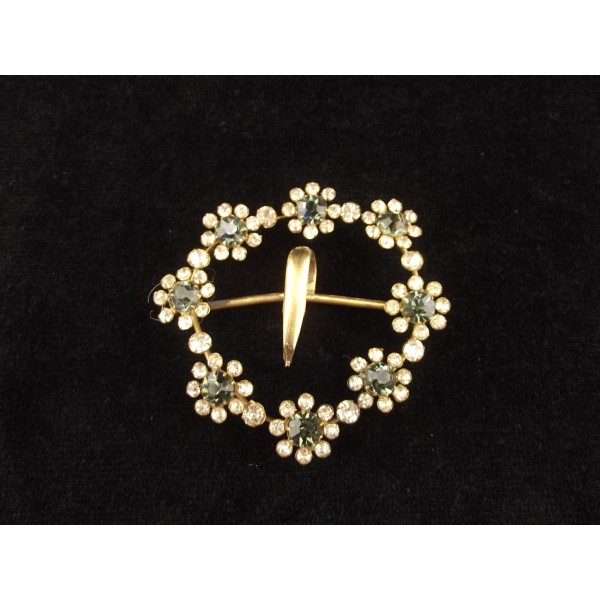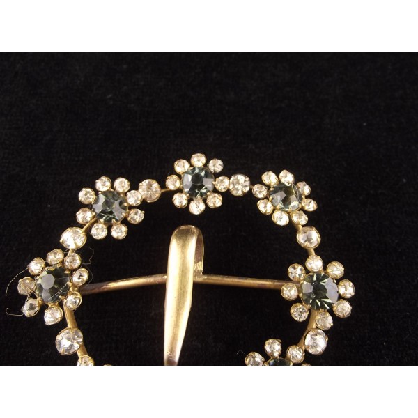 Large pompom belt buckle, decorated with 8 blue and white rhinestone daisies, 19th century.