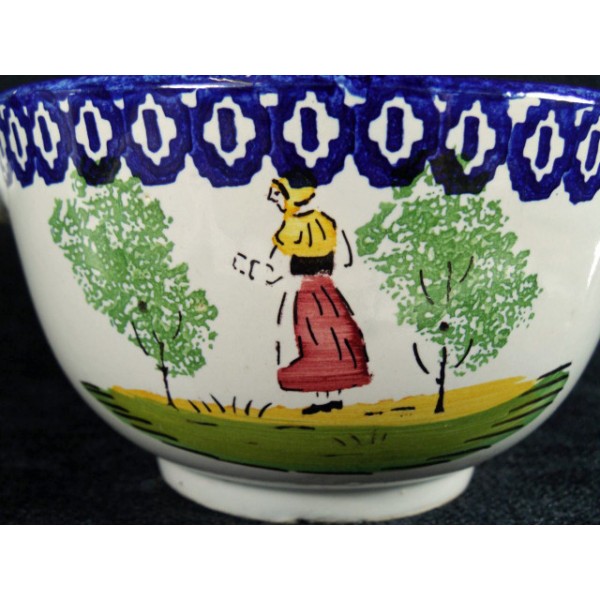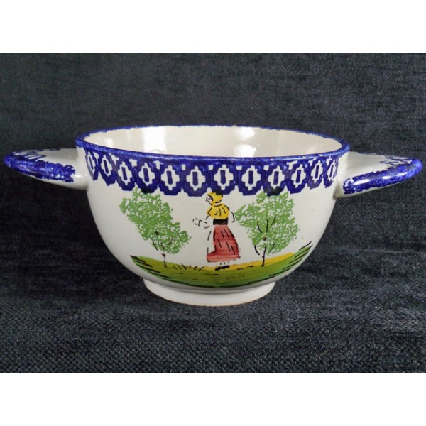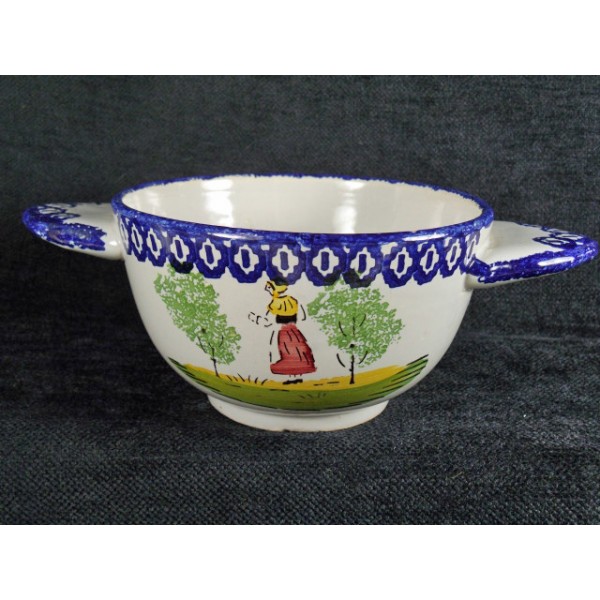Bol à oreille en faïence dans le goût de Quimper, décor de paysanne.