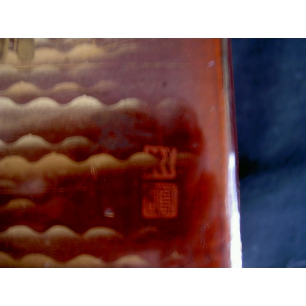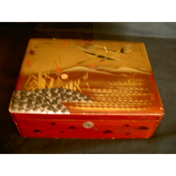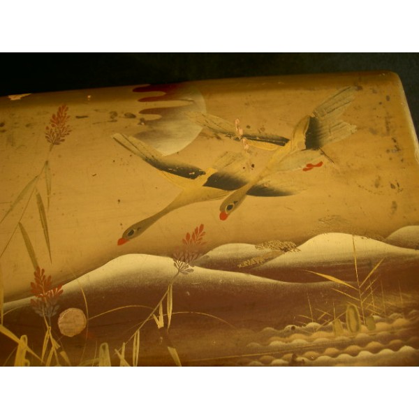 Lacquered wooden box early 20th century, painted gold and black wild geese in flight, signed.