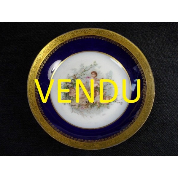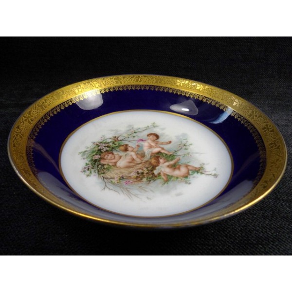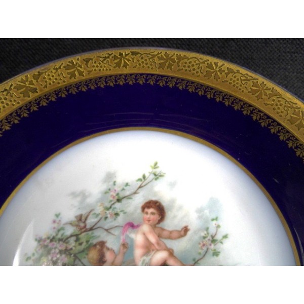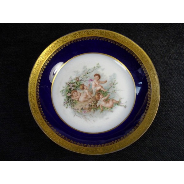 Soup plate decoration blue Limoges porcelain oven, embellished with cherubs nest decoration, gilt edging and double signed MR Limoges France.
