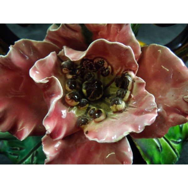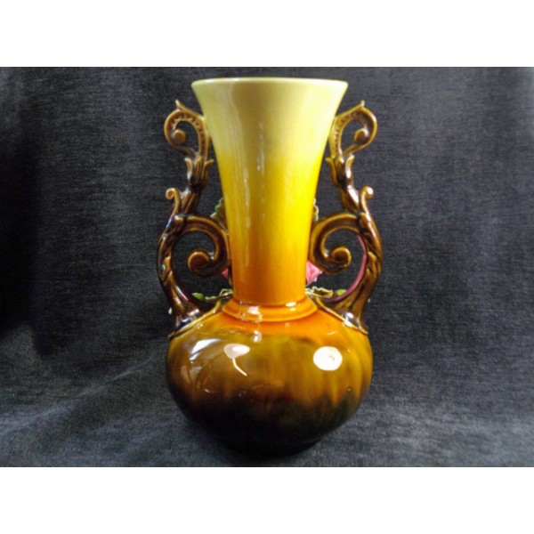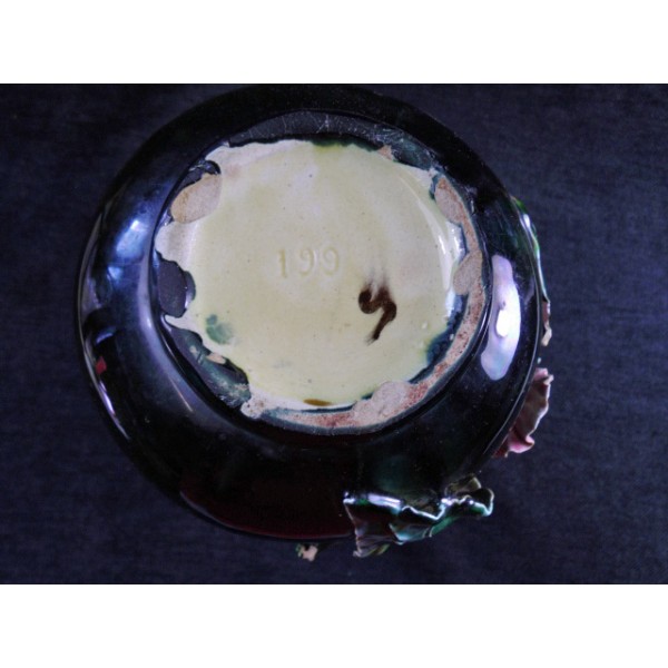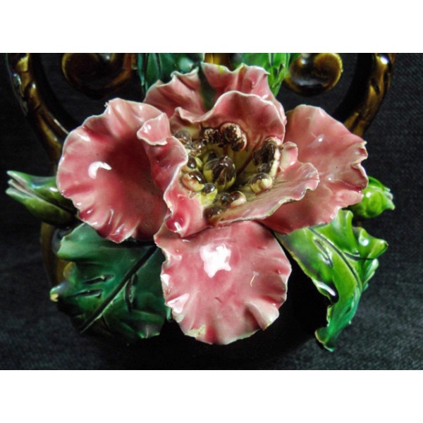 Beautiful old earthenware vase slip decor poppy, 2 handles worked, work from the late nineteenth century, numbered 199 hollow