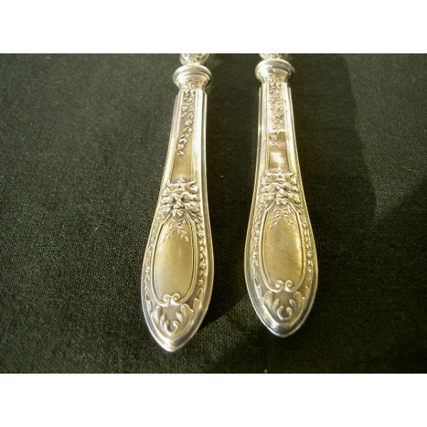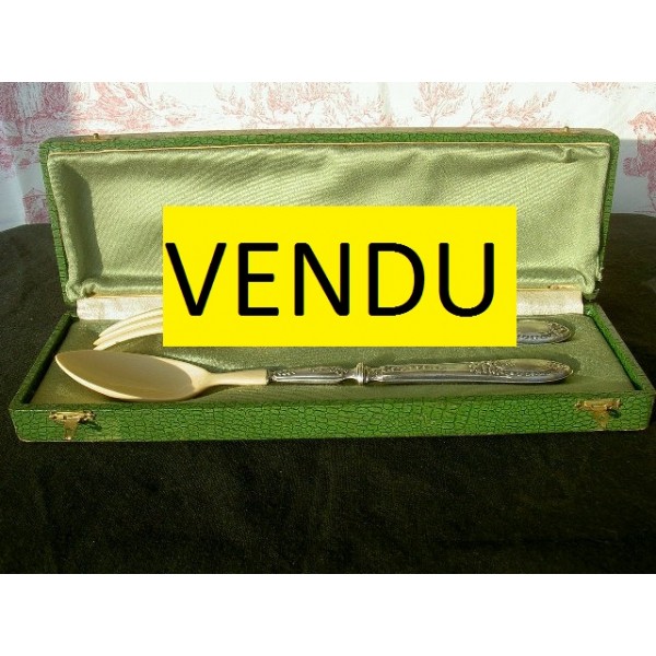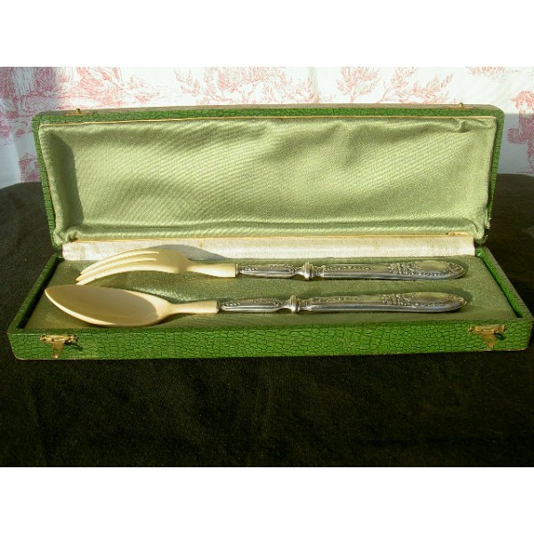 Beautiful flatware salad, stuffed silver handle (punch brace titled 1) and spoon / range in ivory (or ivory), dating from the nineteenth century, decorated head and fauna garland of roses, in good condition, in its box.