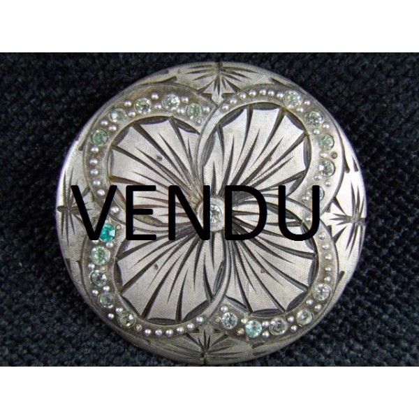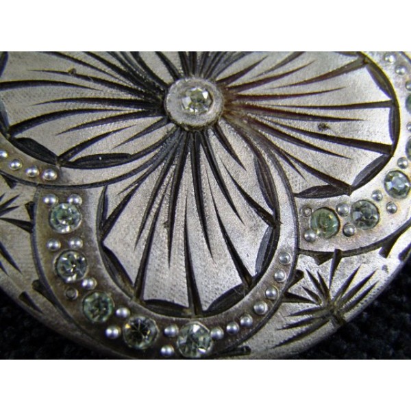 Old celluloid pin, covered with a layer etched silver and adorned with rhinestones, 30/40 years.