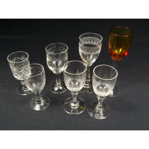 Lot 7 stemware liqueur, 1 Baccarat crystal glass, 2 identical glasses, etched glass 3, 1 color