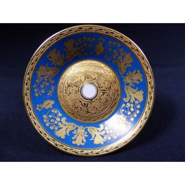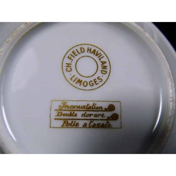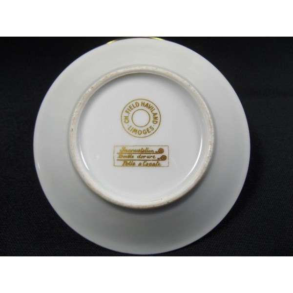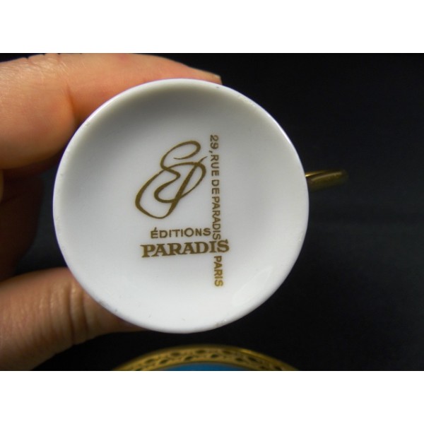 Coffee cup Limoges porcelain (with its saucer) CH. Field Haviland / editions Paradise, double gilt inlay polished agate green blue background.