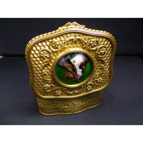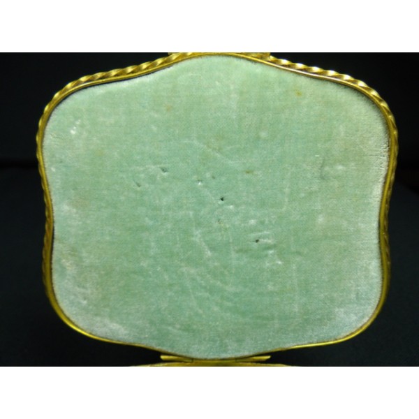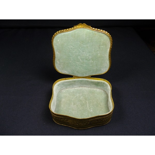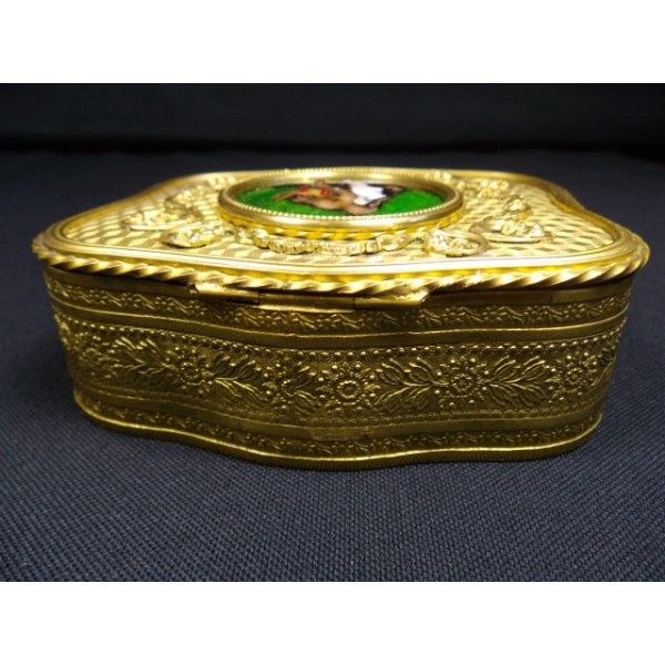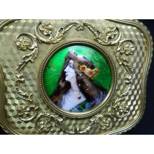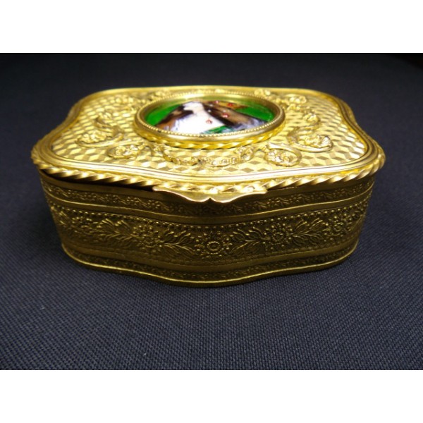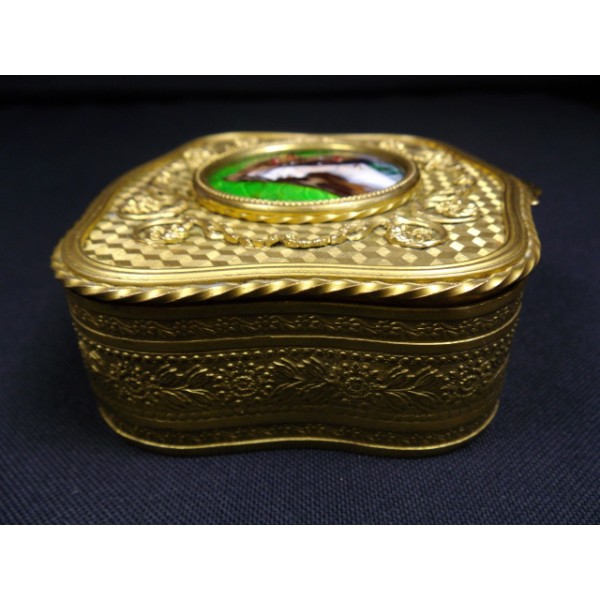 Box gold metal jewelry, decorated on the lid of a medallion painted enamels, period work and art nouveau, inside velvet covered.