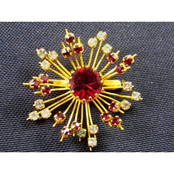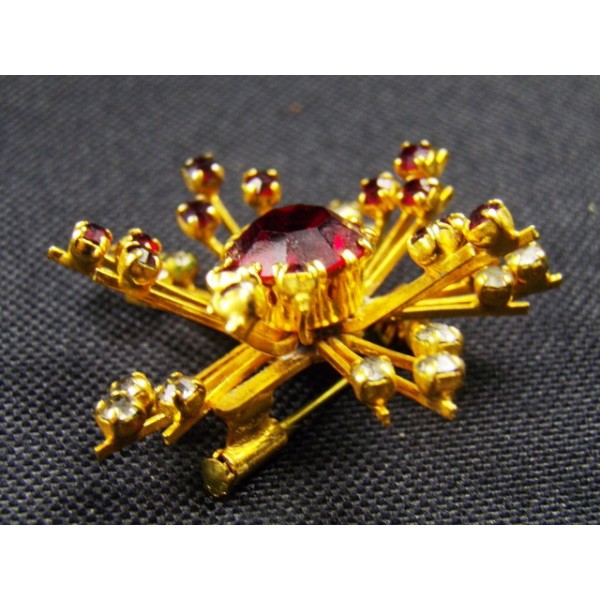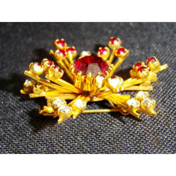 Brooch shaped stylized flower 70s, gilt metal, decorated with red and blue crystal white.