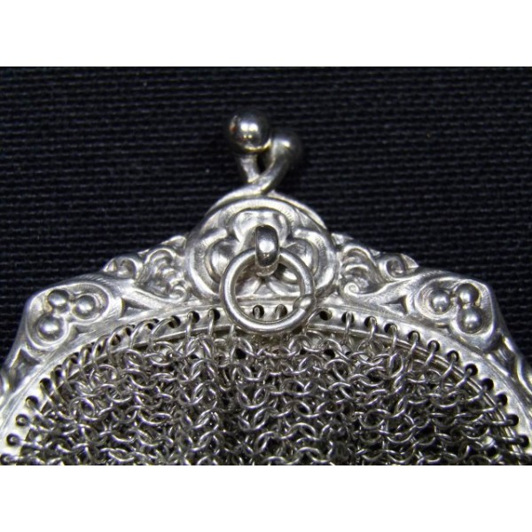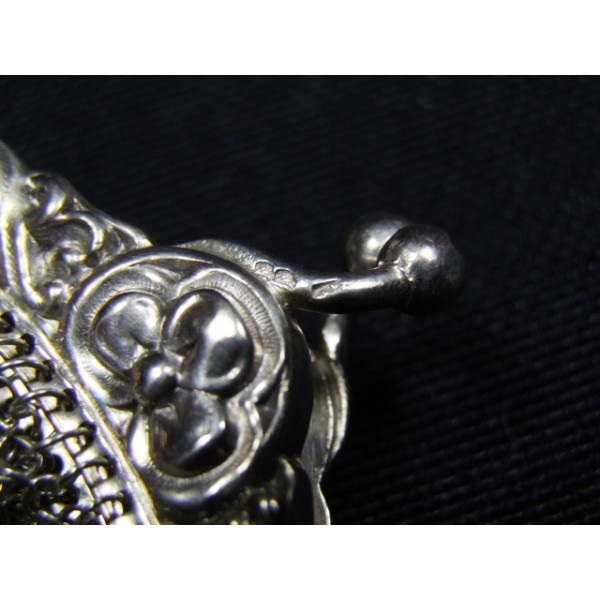 Little purse made of solid silver art nouveau, clover decor, origin France, with two compartments, silver mesh body, equipped with a small ring to be attached to a "châtelaine".