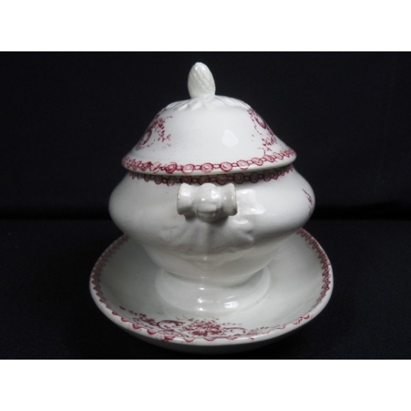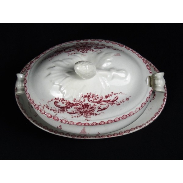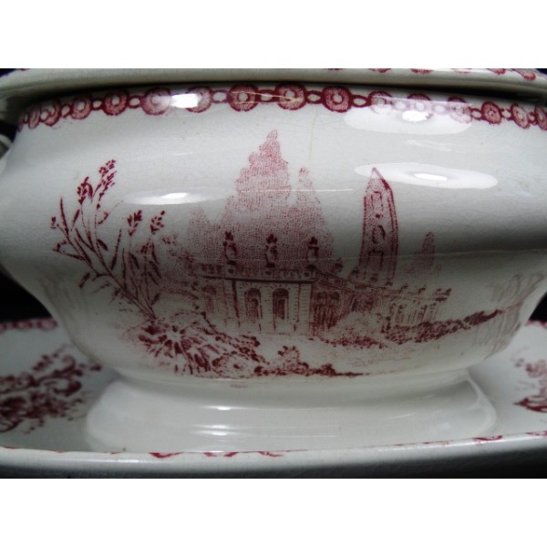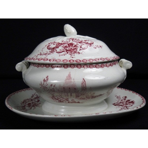 Big and old gravy boat dish earthenware, decor red under cover, shell and XVIII castle parts, old, no apparent mark.