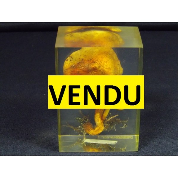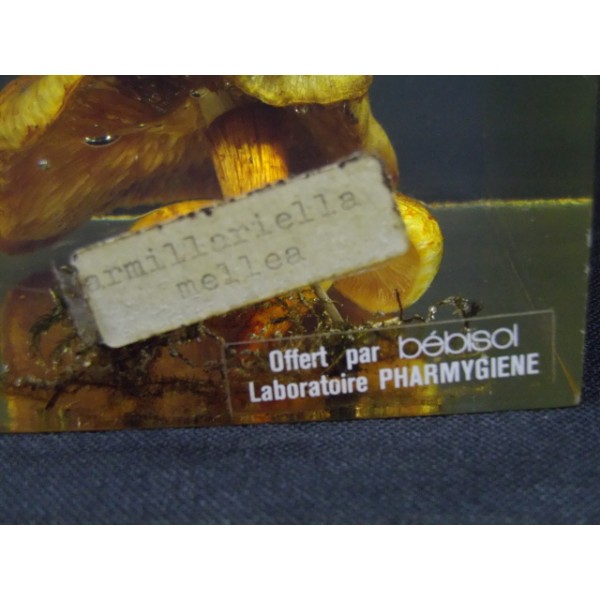 Mushroom inclusion in a resin block, curiosity cabinet, species Armillariella mellea, promotional item for pharmacy offered by Bébisol.