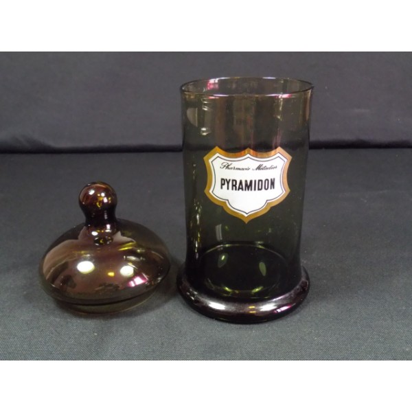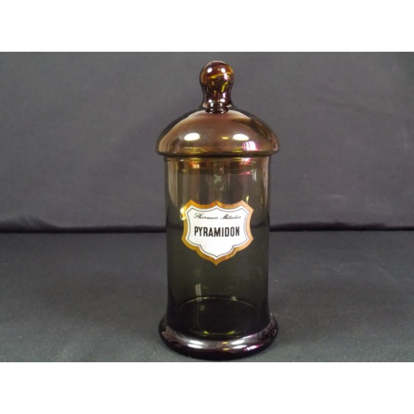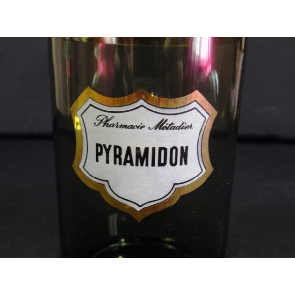 medicine brown glass jar with lid, Pyramidon label Métadier Pharmacy.