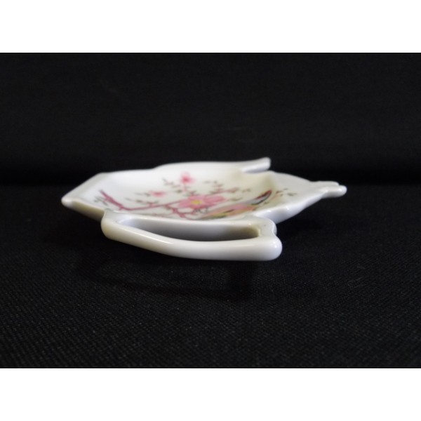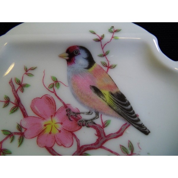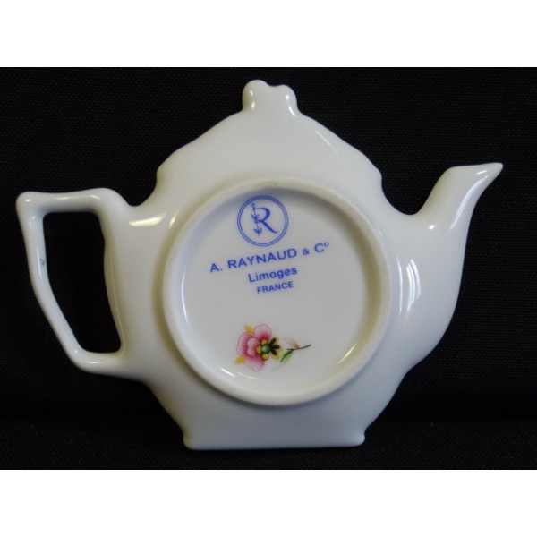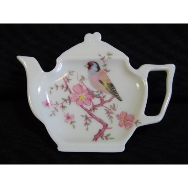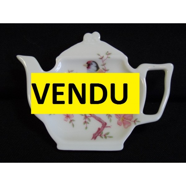 Cup tea-based Raynaud porcelain in Limoges teapot silhouette, goldfinch decoration in a cherry blossom.