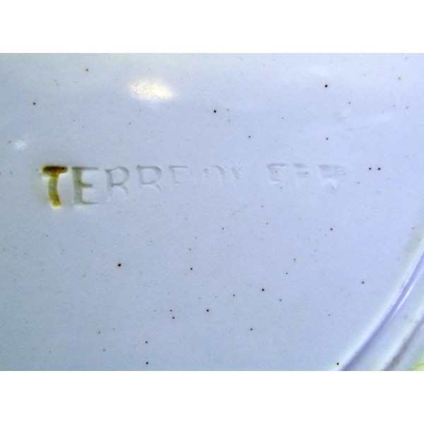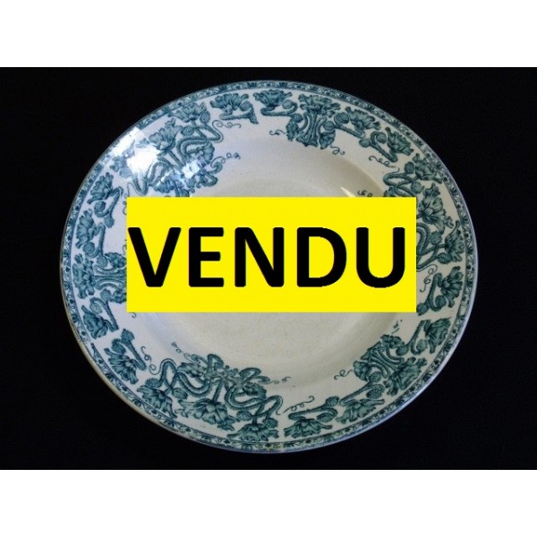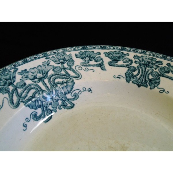 Earthenware soup plate model Terre de fer Marsala, flower decoration of green poppy art nouveau era 1900.