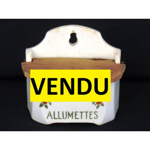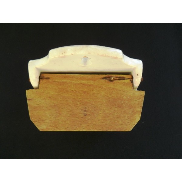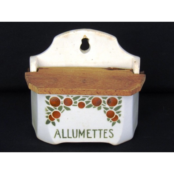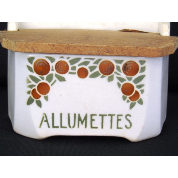 Matchbox in earthenware circa 1930, decorated with fruits (oranges), wooden lid, no mark.