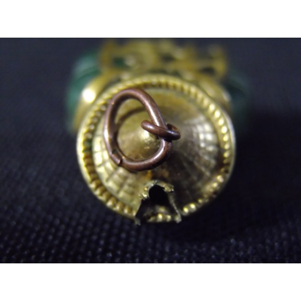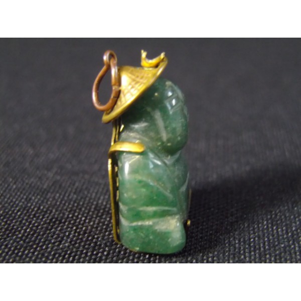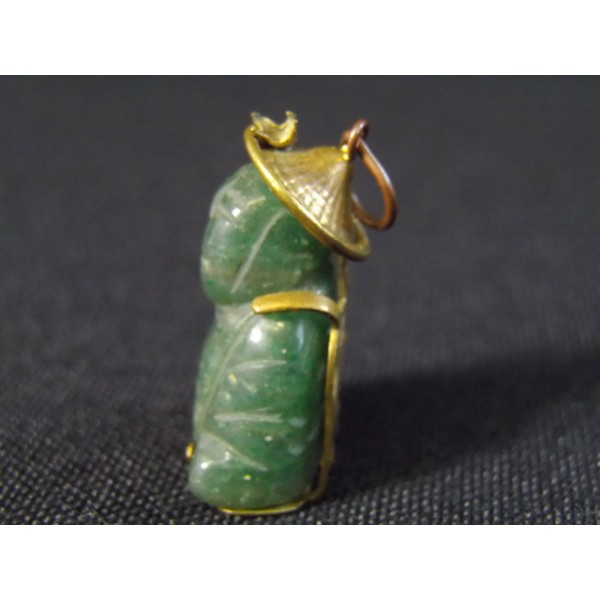 Antique golden metal pendant (brass?) Including a seated Buddha wearing a carved jade.