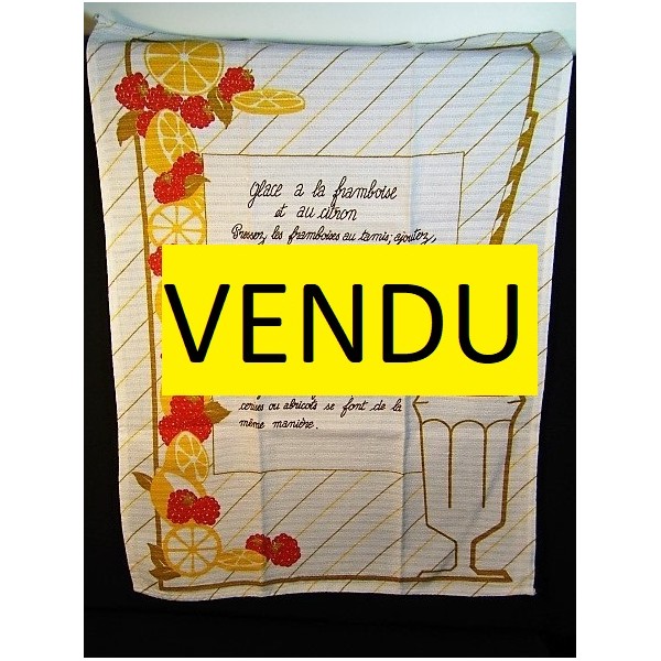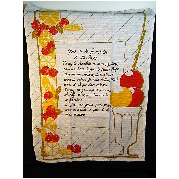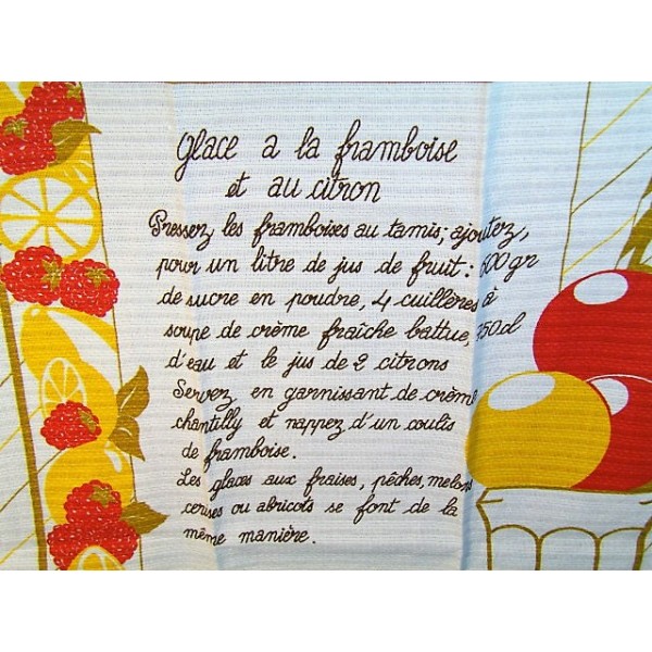 Tea towel illustrating a recipe for cooking, raspberry and lemon ice cream, 70s, pure cotton, made in France.