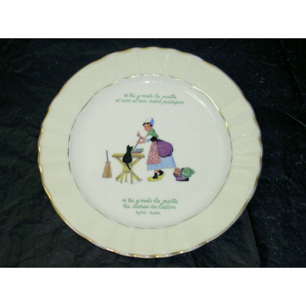 Child chantouré plate edge, hand decorated on the theme of the nursery rhyme with the words of "it was a shepherdess," Limoges porcelain Bernardaud house numbered