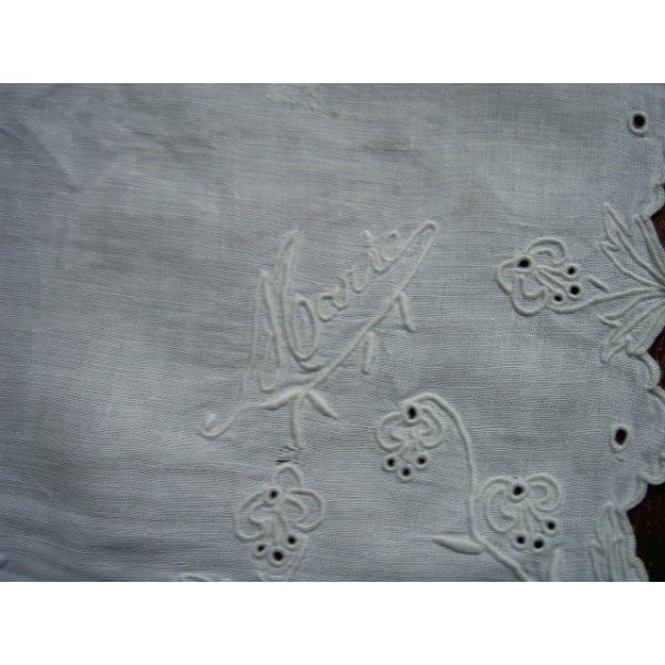 Lovely fine linen handkerchief embroidered with flowers and the name Mary. Note: Some reprisures the former do not alter the beauty of the object. Dimension: 30 cm x 30 cm