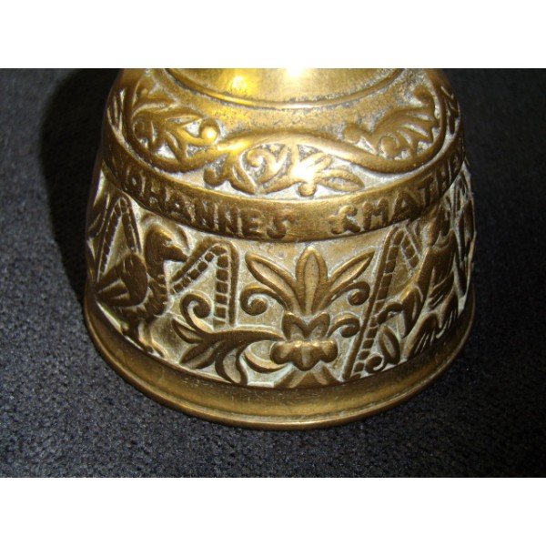 beautiful bronze bell decorated with a frieze with animals, plants and people, with inscriptions, marcus, johannes, lucas, matheus