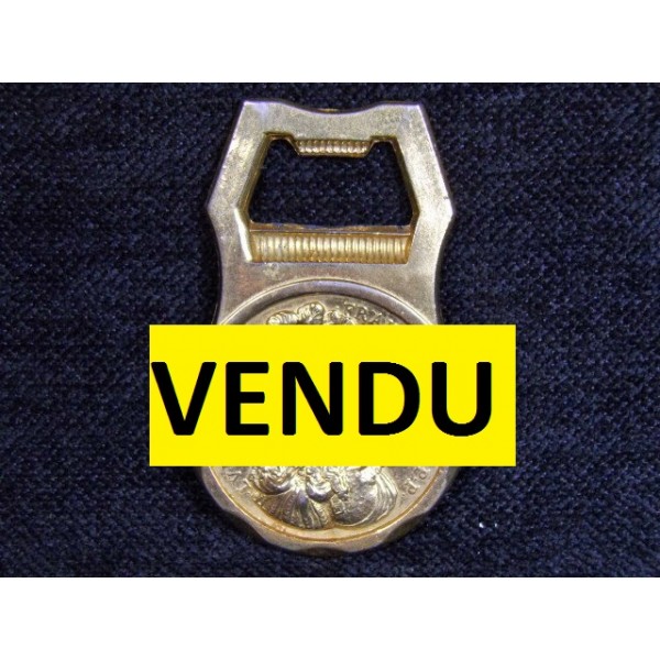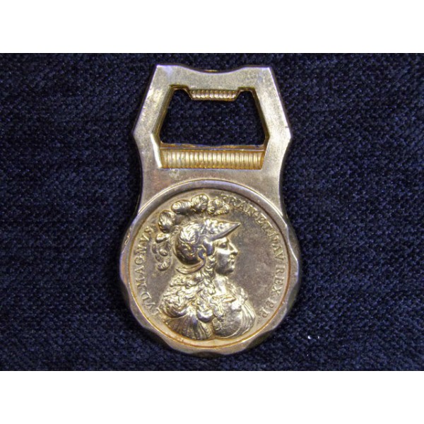 Metal bottle opener with golden effigy of Louis XIV and the chateau of Versailles.
