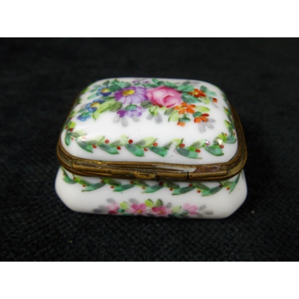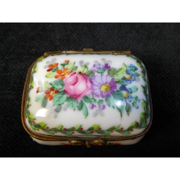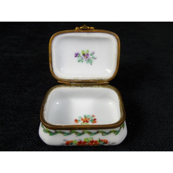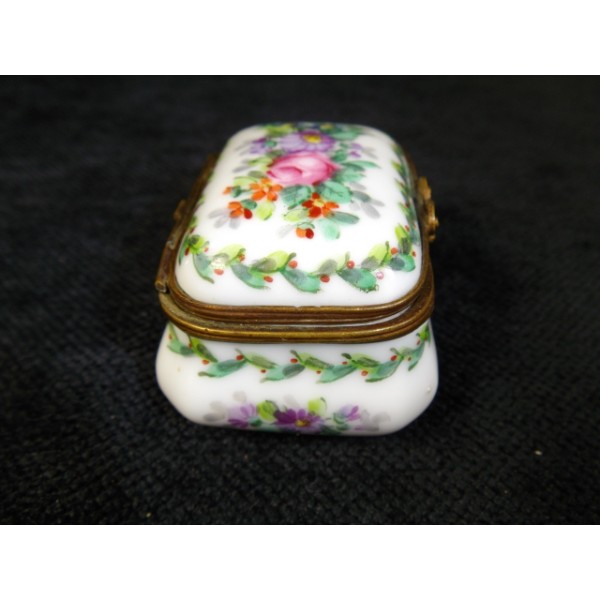Small box antique porcelain floral decoration hand painted, metal locking system, signed initials HA under the bottom.