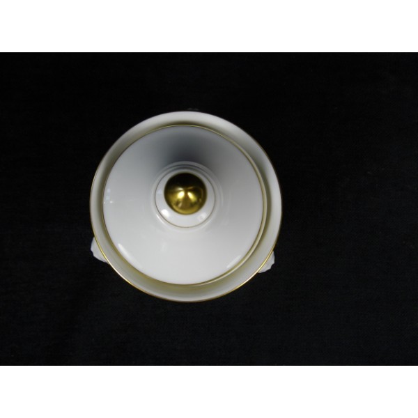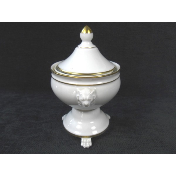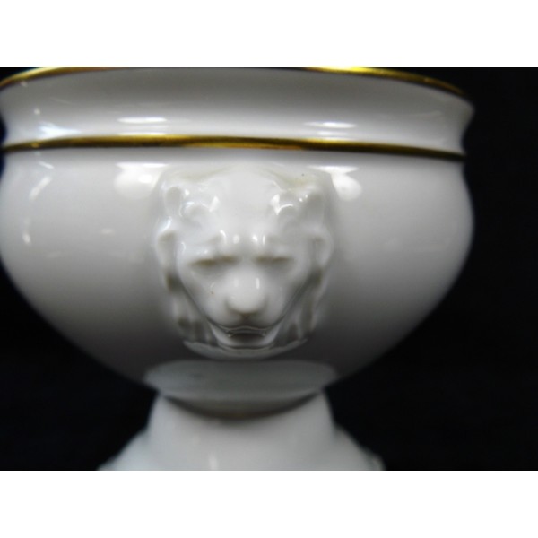 Porcelain jar stamped Chastagner and Co. in Limoges, three lion head handles and three feet legs Leo, two covers one with 7 holes and a full cover with gold taken.