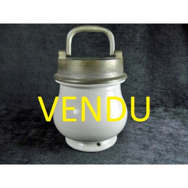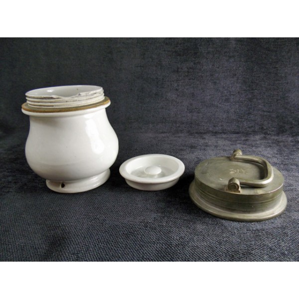Old porcelain jar with metal screw, cahoutchouc to sterilize, holes in the foot to hang upside down to empty and cover stamped with a winged horse trademark