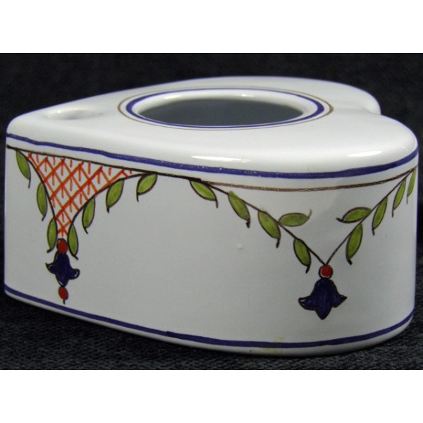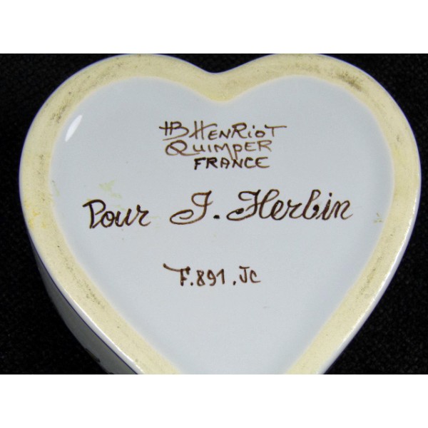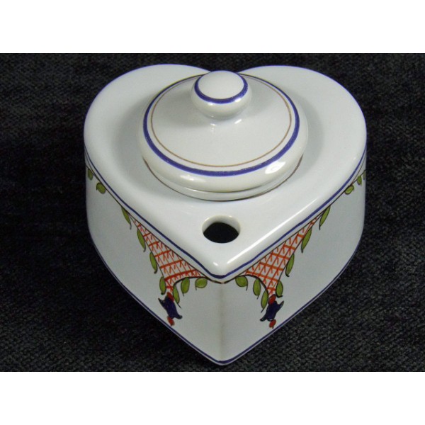 Earthenware inkwell signed HB Henriot Quimper, Quimper France for J. Herbin F.891.JC, heart shape, a pen hole.