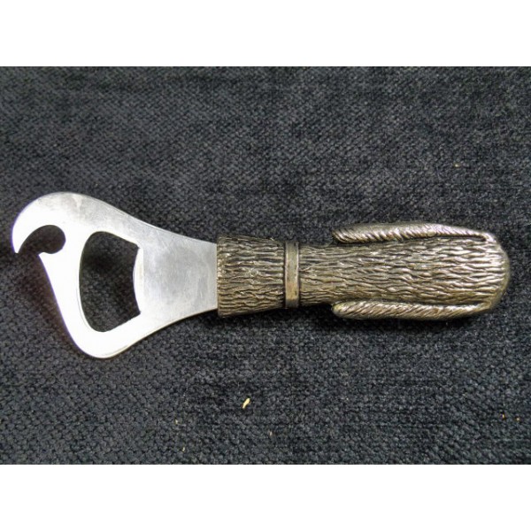 Silver metal bottle opener (for the handle) and stainless steel handle dog head.
