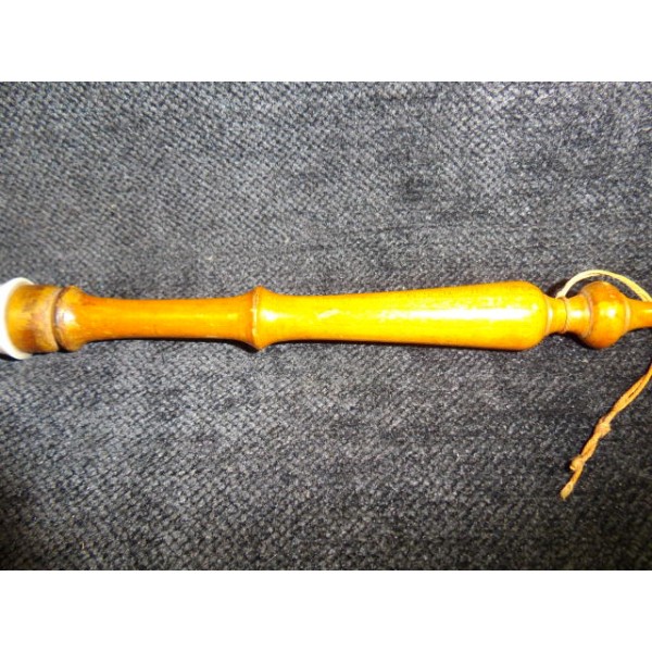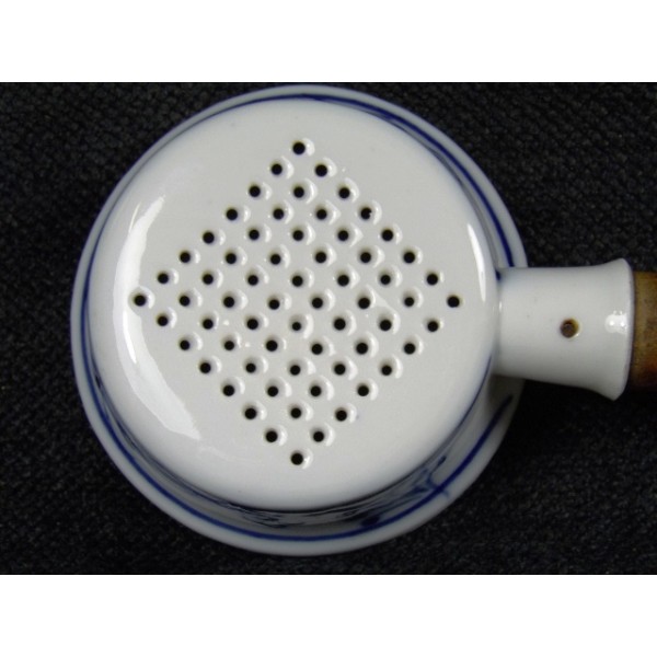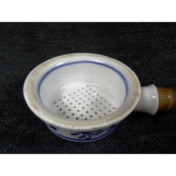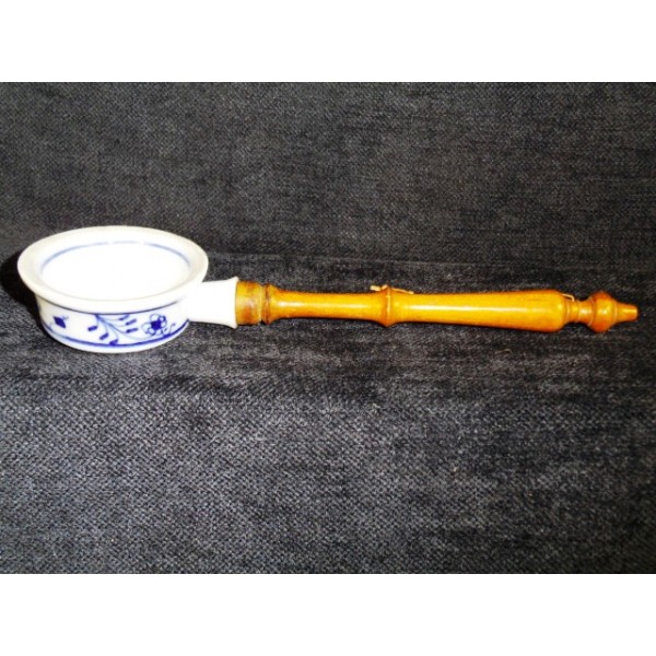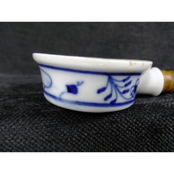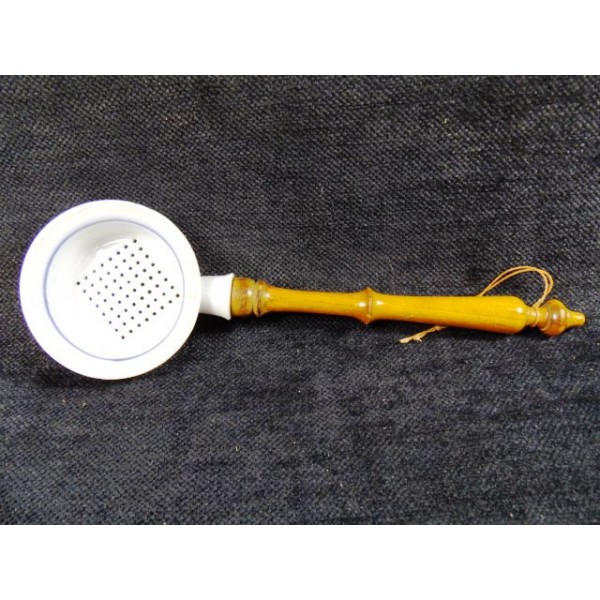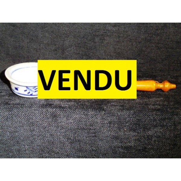Olive spoon old, rare, wooden handle turned and cuilleron pierced porcelain with blue decoration