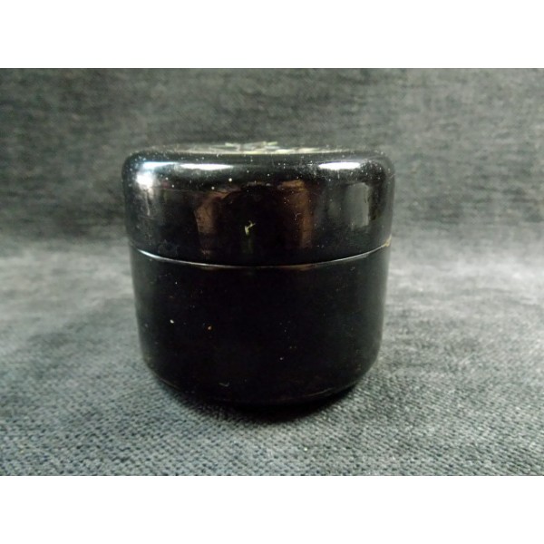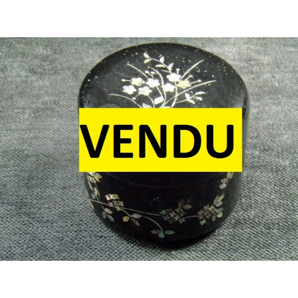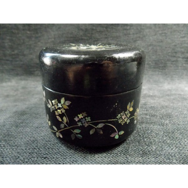 Good condition, there is a small sliver of black Lalaque on the rim of the lid (see photo) and a small crack on the rim of the lid barely noticeable.