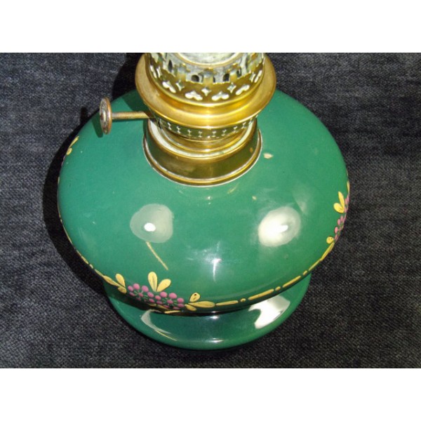 Oil lamp late nineteenth century, foot ceramic enamel painted decoration, complete system with the wick and glass.