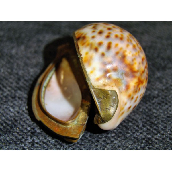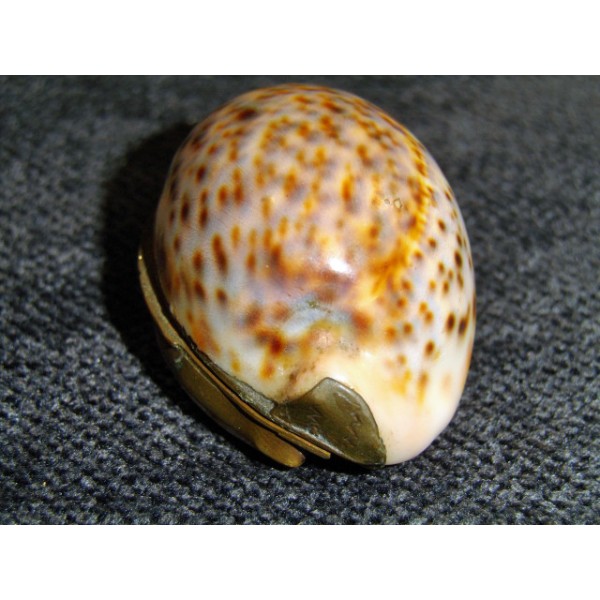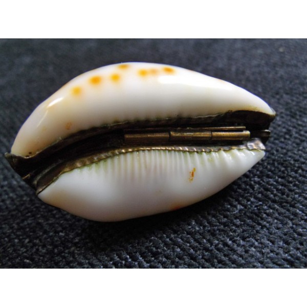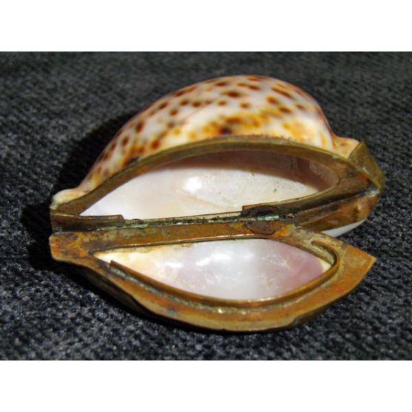 Shell transformed into box beads, brass hinge, former object.
