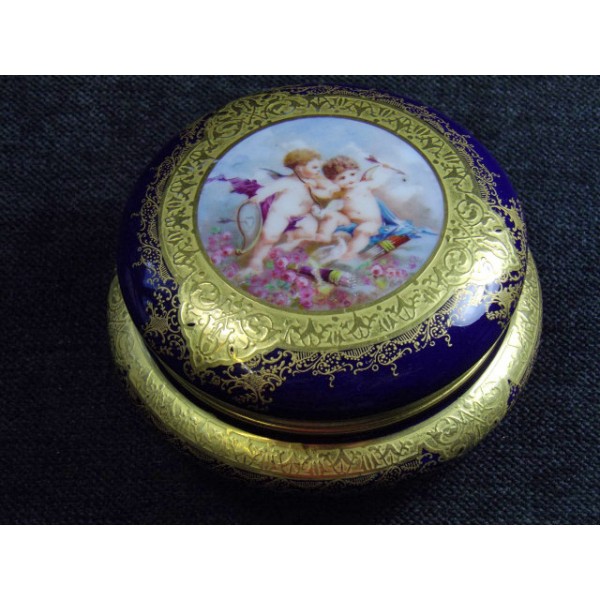 Candy box Limoges porcelain blue "oven", a double gold inlay decoration, medallion d'Amours, raised hand, early Twentieth stamped T & V France.