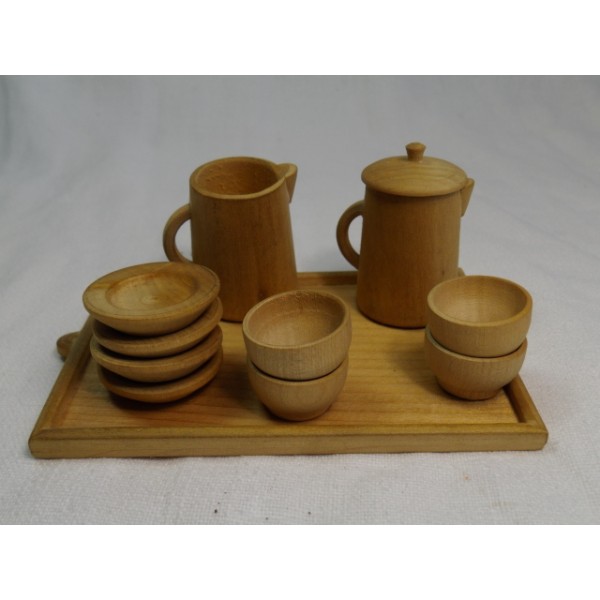 Originale petite dînette en bois très léger des années 60/70, composée d'un plateau, un pichet, une verseuse, 4 bols et 4 assiettes.