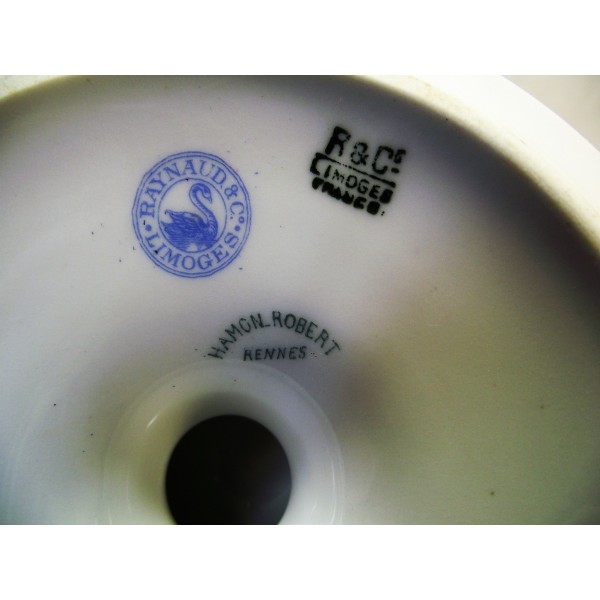 Très joli compotier ancien ou plat à gâteau, en porcelaine de Limoges estampillé de la maison Rayaud et Hamon Robert de Rennes, décor de roses jaunes et bleues.