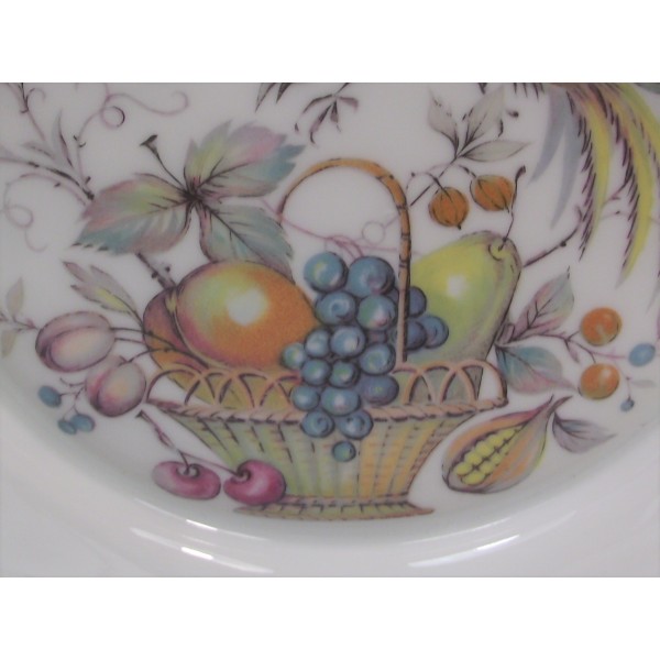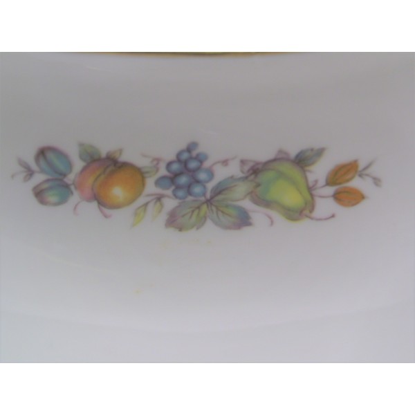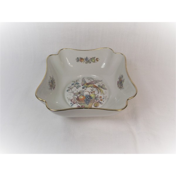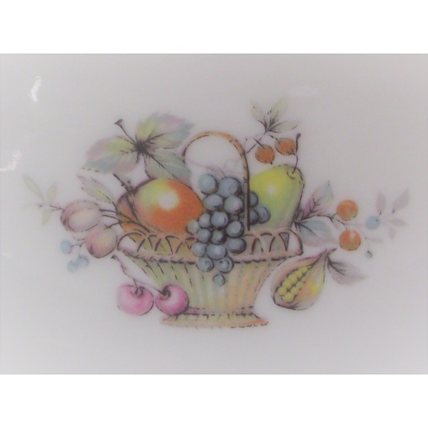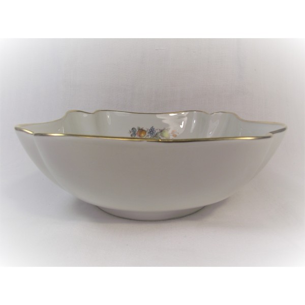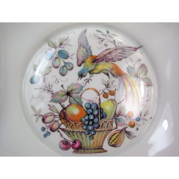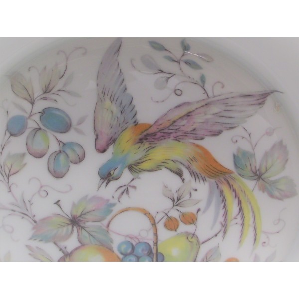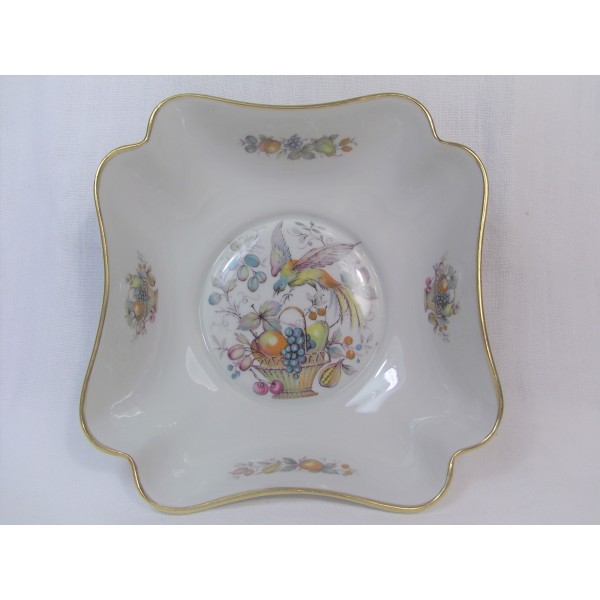 Très joli petit plat saladier polylobé en porcelaine de Limoges à décor d'oiseau de Paradis et panier de fruits.
