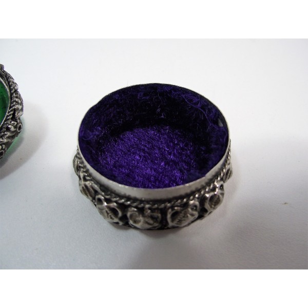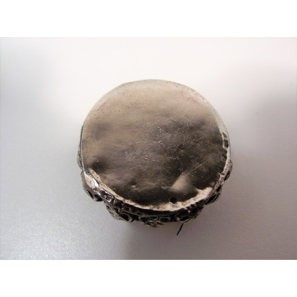 Boîte à pilules ou petite boîte à bijoux en argent bas titre étranger (pas de poinçon visible), couvercle en verre orné en son centre d'une pierre.