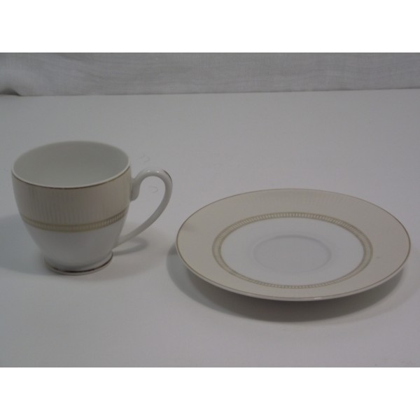 Dimensions : tasse hauteur 7,5 cm, diamètre max 8 cm, diamètre base 4,8 cm, contenance 15 cl, sous-tasse diamètre 16 cm.