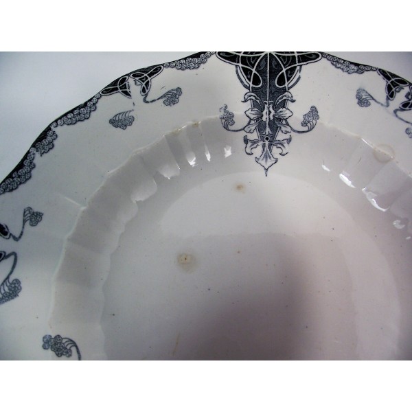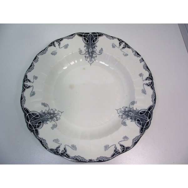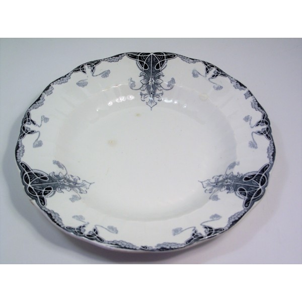 Plat rond creux, dit plat à viande en sauce, en faïence de Clairefontaine par Léon Graves, gérant de 1890 à 1913, décor végétal Art Nouveau noir et gris.