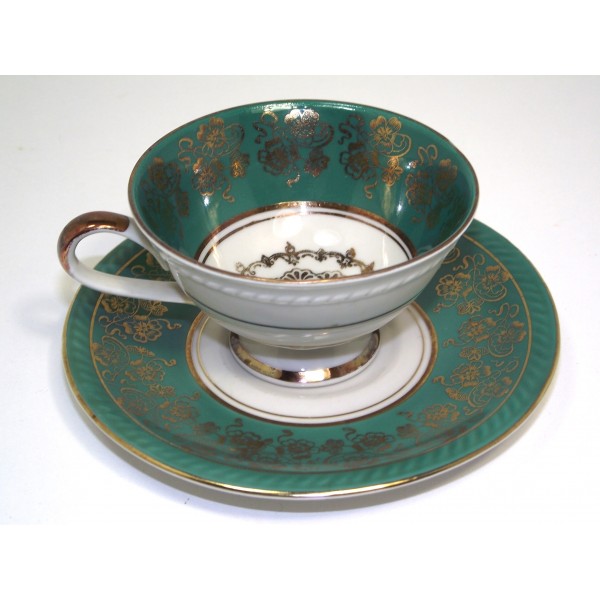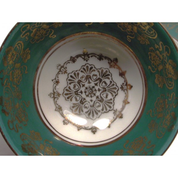 Tasse à café ancienne en porcelaine de Saxe , estampillée Deutschland et marque du fabricant, décor vert et doré, forme antique de coupe sur pied.