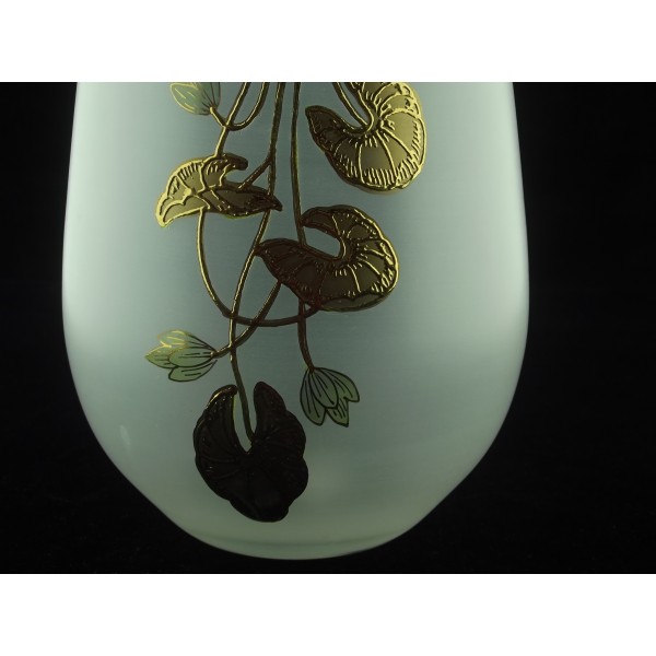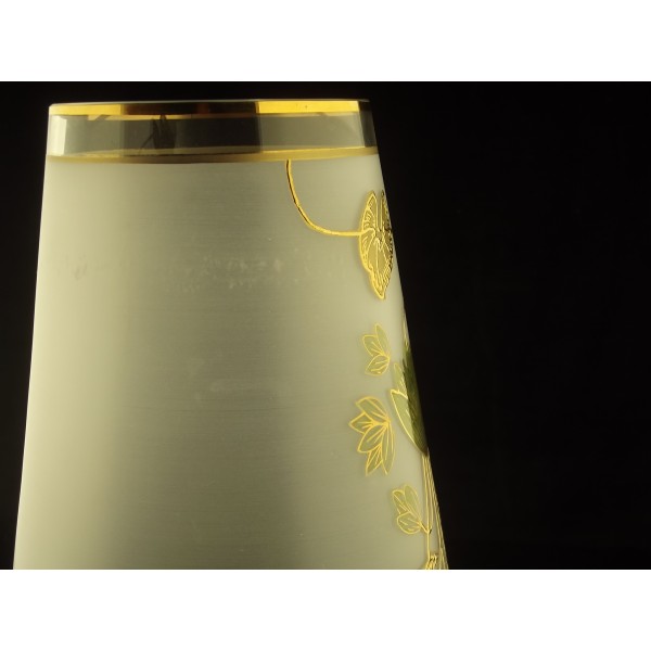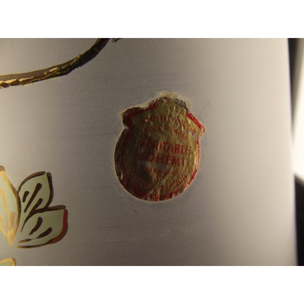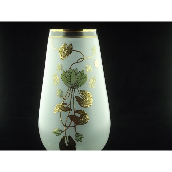 Vase cônique en cristal dépoli de Bohëme, soufflé à la bouche, décoré à la main de nymphéas, étiquette de fabrication (voir photo).