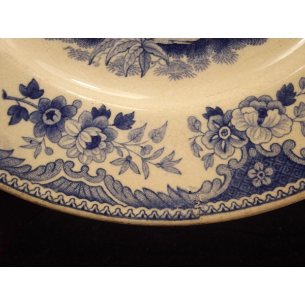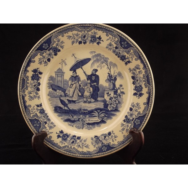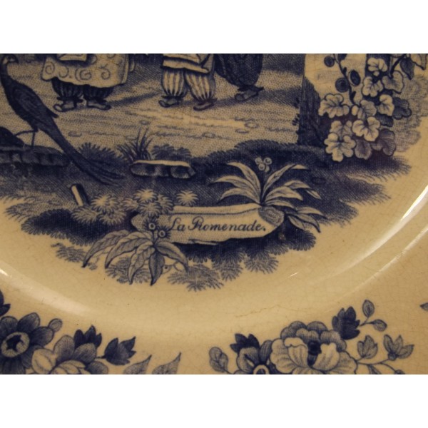 Assiette ancienne en faïence par Louis Lebeuf à Montereau, vers 1850, à décor bleu de scène de vie chinoise, intitulée "la promenade".